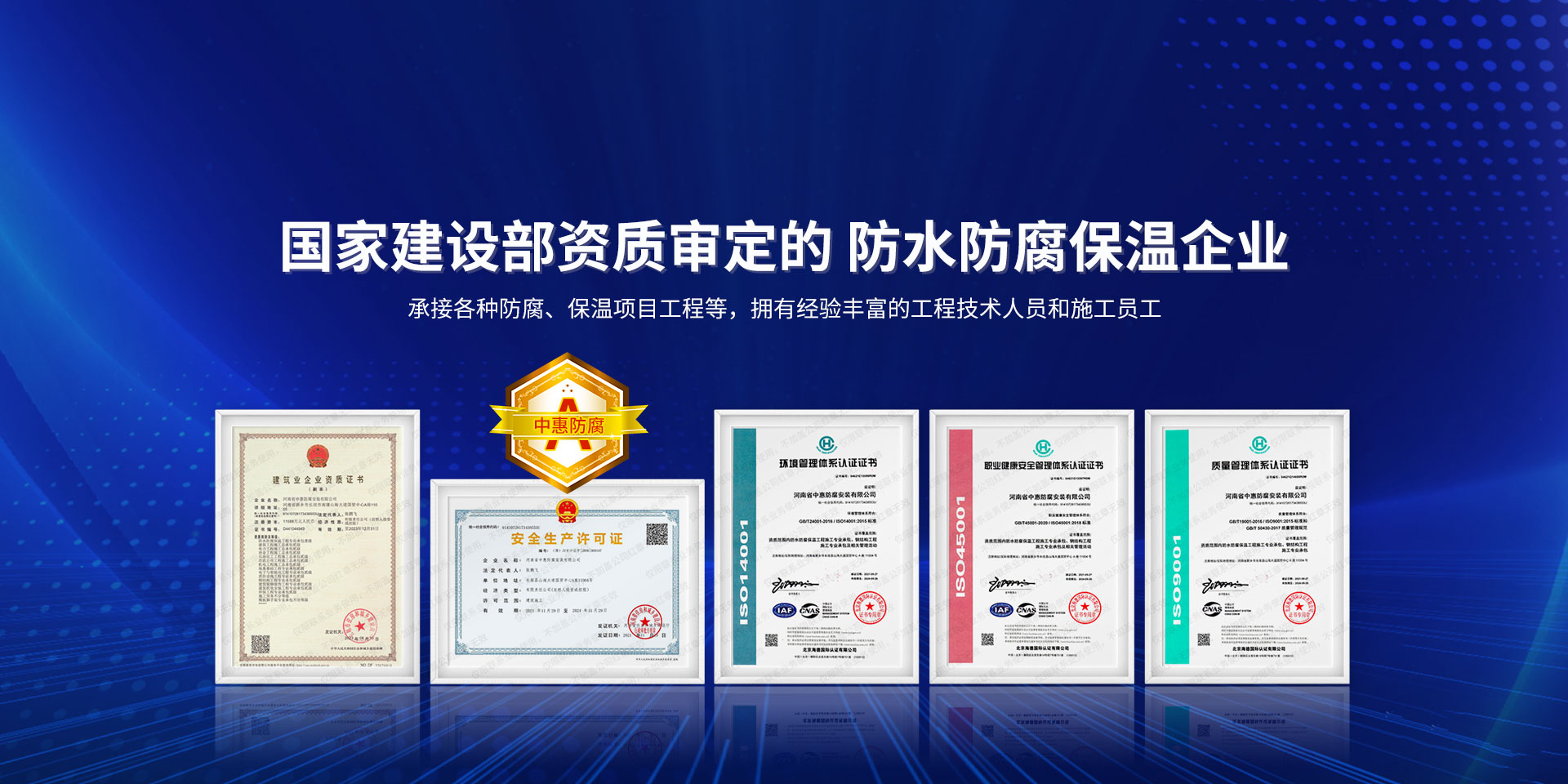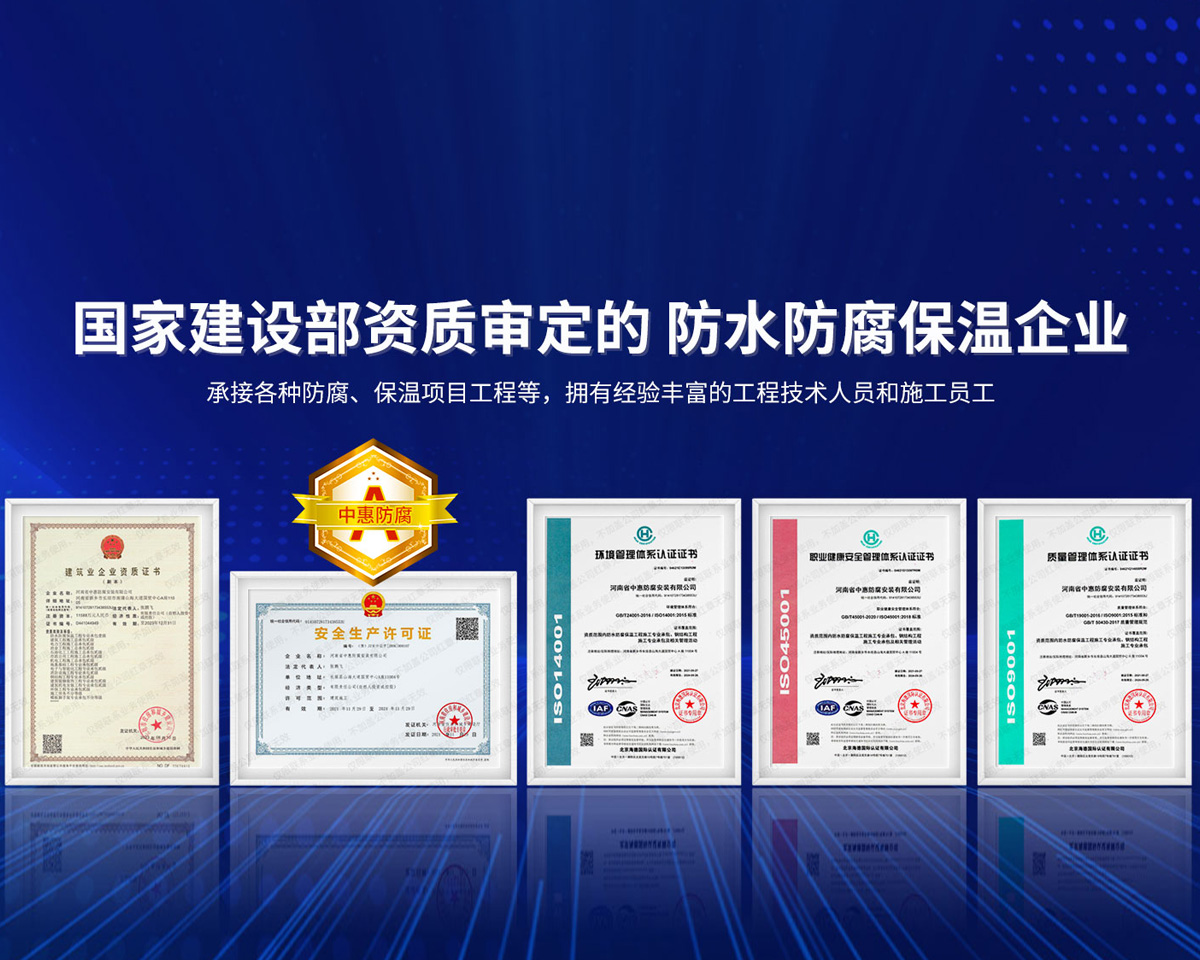 公司經營范圍:防水防腐保溫工程;消防設施工程;建筑裝修裝飾工程;建筑機電安裝工程;電力工程;建筑工程;石油化工工程;工業清洗工程;油罐清洗工程;鋼結構工程;環保工程;模板腳手架工程;電纜防火封堵、防污閃噴涂、外墻外保溫工程;各類施工勞務作業;設備維修、船舶鉚焊、涂裝;電力工程材料、建材、防水材料、防火材料、防腐保溫材料銷售,并相繼通過了GB/T19001-2008idtISO9001:2008GB/T50430-2007質量管理體系認證證書。GB/T24001-2004idtISO14001:2004環境管理體系認證證書。GB/T28001-2011idtOHSAS18001:2007職業健康安全管理體系認證證書。公司是中國防腐蝕于防護協會、中國施工企業管理協會、電力協會和中國鋼結構防水協會會員單位。 公司的經營業務涵蓋了石油、化工、電力、冶金、煤炭、船舶、國防、燃氣、水利、環保、交通運輸、航空及國防軍工和輕紡市政等行業的防腐保溫絕熱設備。鋼結構安裝、防火、防水、金屬噴鍍、聚脲噴繪、陰極保護、防滲透堵漏、玻璃鋼及各種磚版材料襯里、橡膠襯里、煙氣硫和耐酸溶劑腐蝕等工程施工。公司連續十年榮獲“省市先進施工企業”“安全生產先進單位”“重合同,守信用企業”和“AA***資質企業”的稱號。2000年被命名為市級文明單位,2002年被國家工商行政管理局命名為“重合同,守信用的企業”、被中國工業防腐蝕技術協會命名為“防腐蝕企業,能源節約及環境保護領域有豐富的經驗和***的業績。工程一次交驗合格率100%。其中攀枝花鋼鐵公司煉鐵廠四號高爐及熱風爐防腐工程、上海寶鋼公司煤氣柜防腐工程、撫順石油一廠裝置防腐項目、齊魯石化公司稀烴廠高塔防腐工程、吉林化學工業公司煉油廠油罐防腐工程、天津石化熱電廠六號爐頂棚聯絡管保溫工程、大慶油田(太倉)力神泵業工程、中國化學工程第十一建設工程、中原油田勘探局工程、中國石化銷售有限公司華北分部、魯皖輸油管道工程、貴州開磷息烽合成氨工程、陜西黃陵煤化工程、中國石油天然氣西部管道塔里木輸油工程、邯鋼集團邯寶鋼鐵公司煉鐵工程、德州供電工程、吉寶(南通)船廠工程,偃師華潤熱力工程、鄭州熱力總公司。 河南省中惠防腐安裝有限公司愿以豐富的施工經驗,***的技術,***的設備,***的管理,***的服務,竭誠為國內外廣大的用戶提供***滿意、******的工程作品。 我公司愿與國內外同仁一道,團結協作,共同推進防腐蝕行業發展! 公司地址:河南省長垣縣建設路北段360號 固定電話:0373-8866488 郵編:453400 網址:http://www_zhff_com_cn.zjzsyf.com
